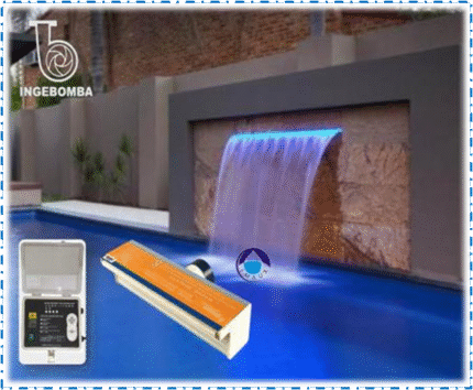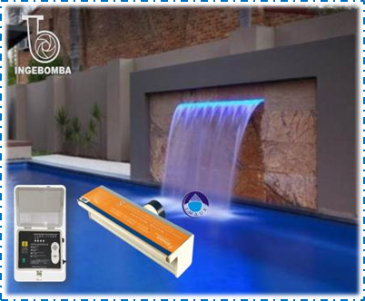Cascada decorativa con iluminación LED RGB, ideal para generar un efecto de velo de agua laminar en piscinas, combinando estética y funcionalidad.