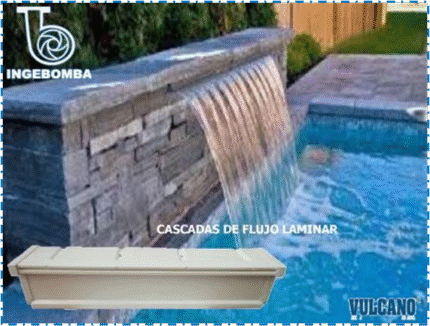 Cascada decorativa para piscinas, diseñada para generar un elegante velo de agua laminar con un ancho de 400 mm y espesor de 3 mm. Fabricada en ABS de alta resistencia, para instalación empotrada en muros.