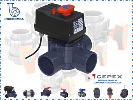 La válvula motorizada Cepex de tres vías ofrece un control automatizado y confiable para sistemas hidráulicos. Fabricada en PVC-U de alta resistencia, combina durabilidad con facilidad de operación en aplicaciones exigentes.